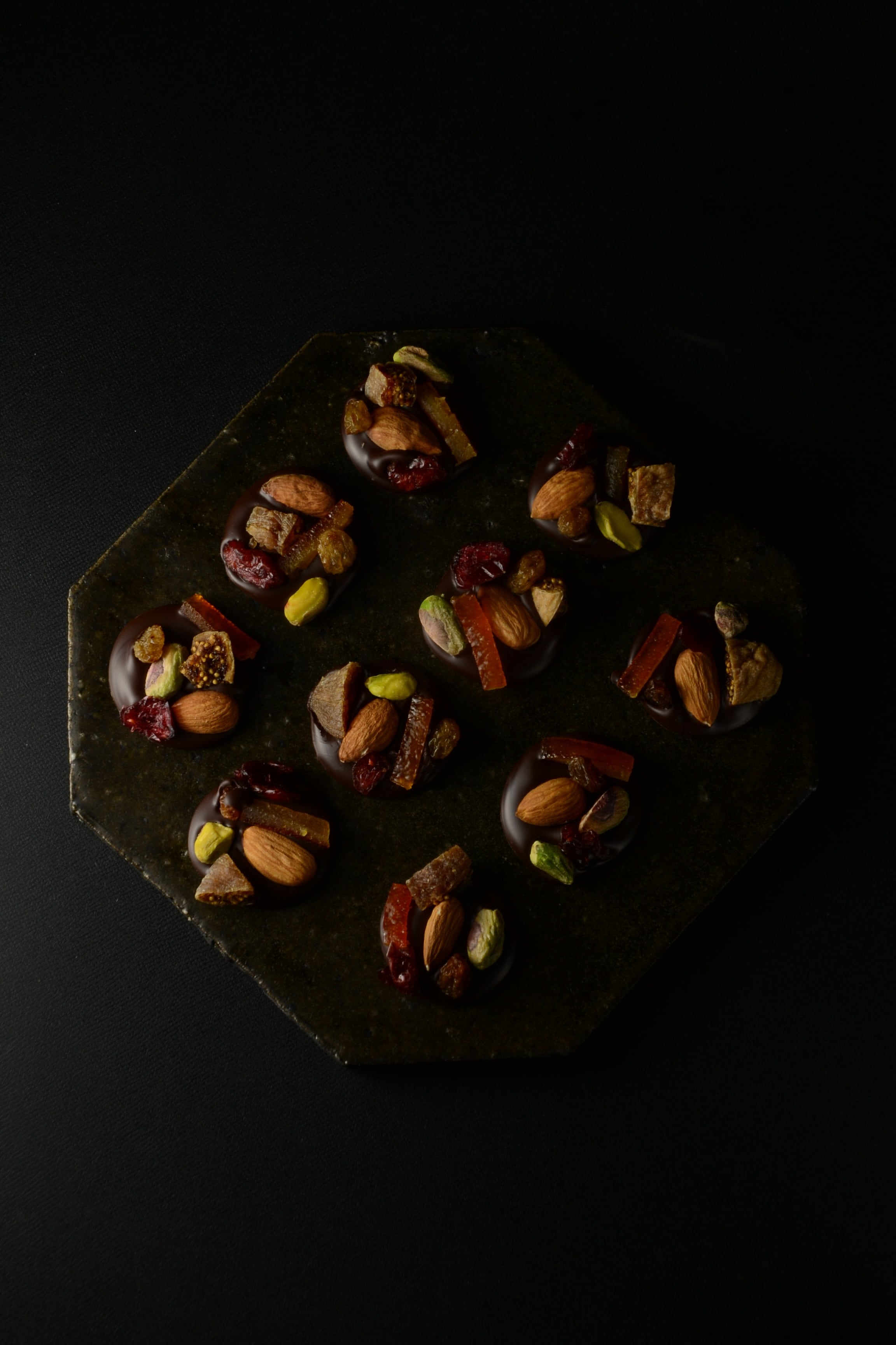厳選したオレンジピール、ドライイチジク、クランベリー、レーズンを一つ一つ丁寧にトッピング。アーモンド、ピスタチオもチョコレート、ドライフルーツとのバランス、ハーモニーを考えローストしました。
